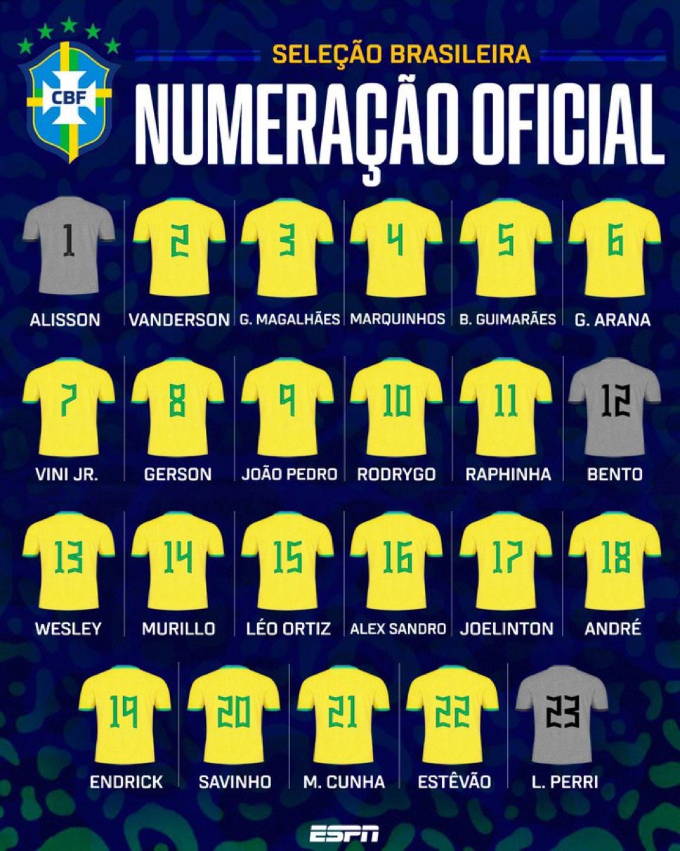 03月20日訊 巴西國家隊公布新一期球員號碼,其中維尼修斯7號,羅德里戈10號,若昂-佩德羅9號,恩德里克19號。