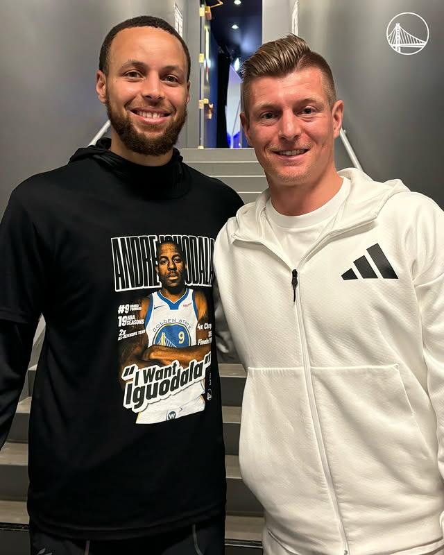 克羅斯現(xiàn)場看勇士vs獨行俠&伊戈達拉球衣退役儀式,賽后合影庫里