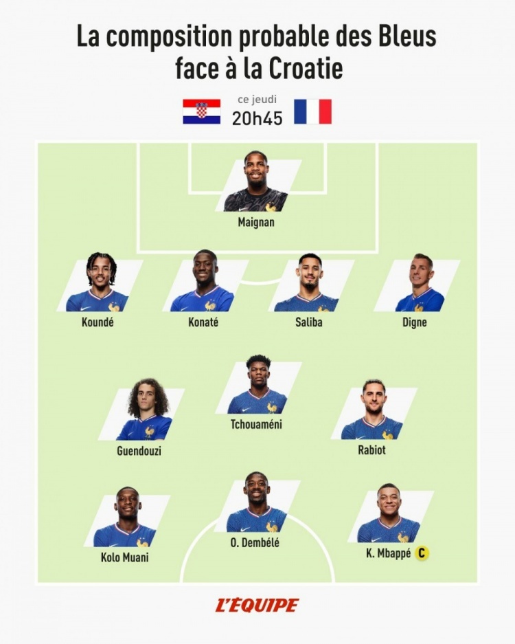 3月20日訊 北京時(shí)間明天凌晨3點(diǎn)45分,法國(guó)將在歐國(guó)聯(lián)1/4決賽首回合比賽中客場(chǎng)對(duì)陣克羅地亞?!蛾?duì)報(bào)》預(yù)測(cè)了法國(guó)隊(duì)本場(chǎng)比賽的首發(fā)陣容,姆巴佩、登貝萊、穆阿尼三箭齊發(fā)。