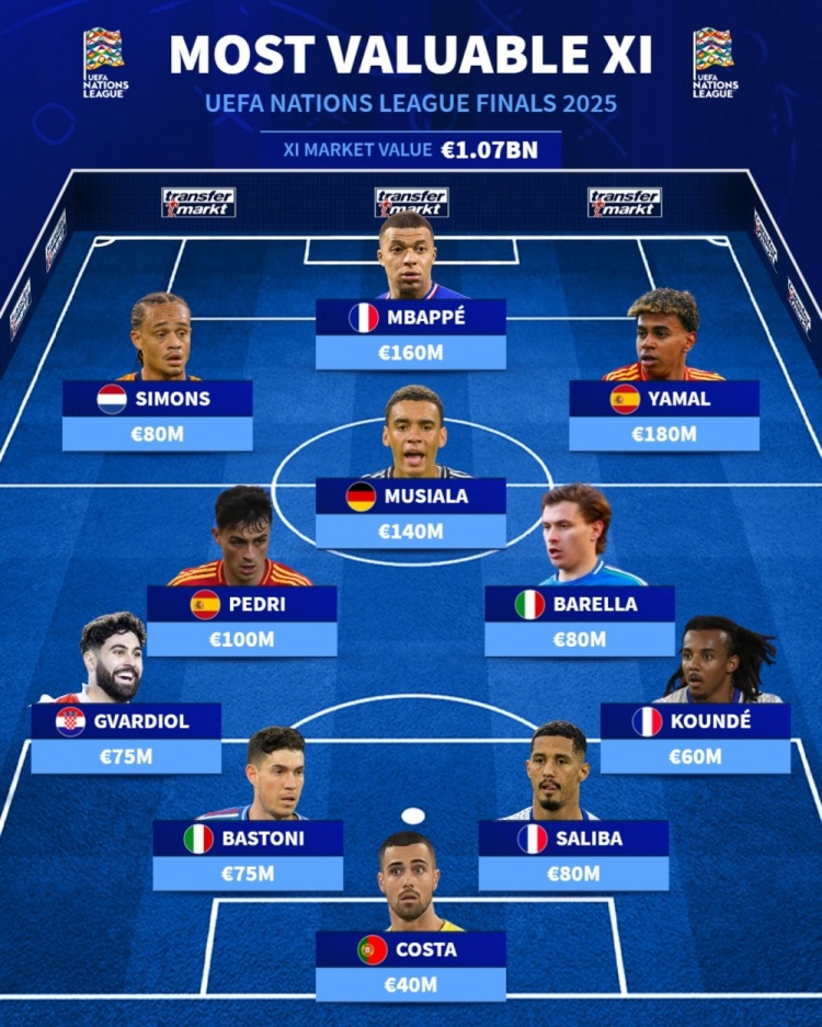 2025-03-21 09:22:48歐國聯(lián)1/4決賽最貴陣容:姆巴佩、亞馬爾在列,總價10.7億歐
