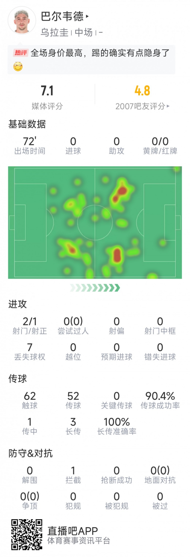 2025-03-22 10:09:03存在感不強(qiáng),巴爾韋德本場數(shù)據(jù):2射1正,對抗&搶斷等數(shù)據(jù)掛零