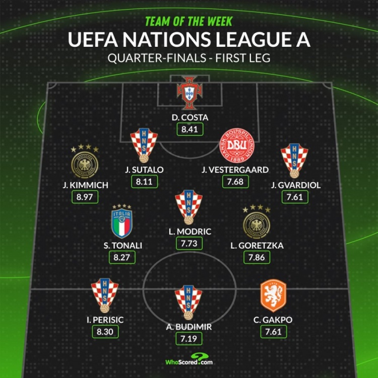 3月21日訊 歐國聯(lián)A級(jí)別八強(qiáng)戰(zhàn)首回合已經(jīng)完賽,whoscored也列出了本輪評(píng)分最佳陣容,克羅地亞5將在列。