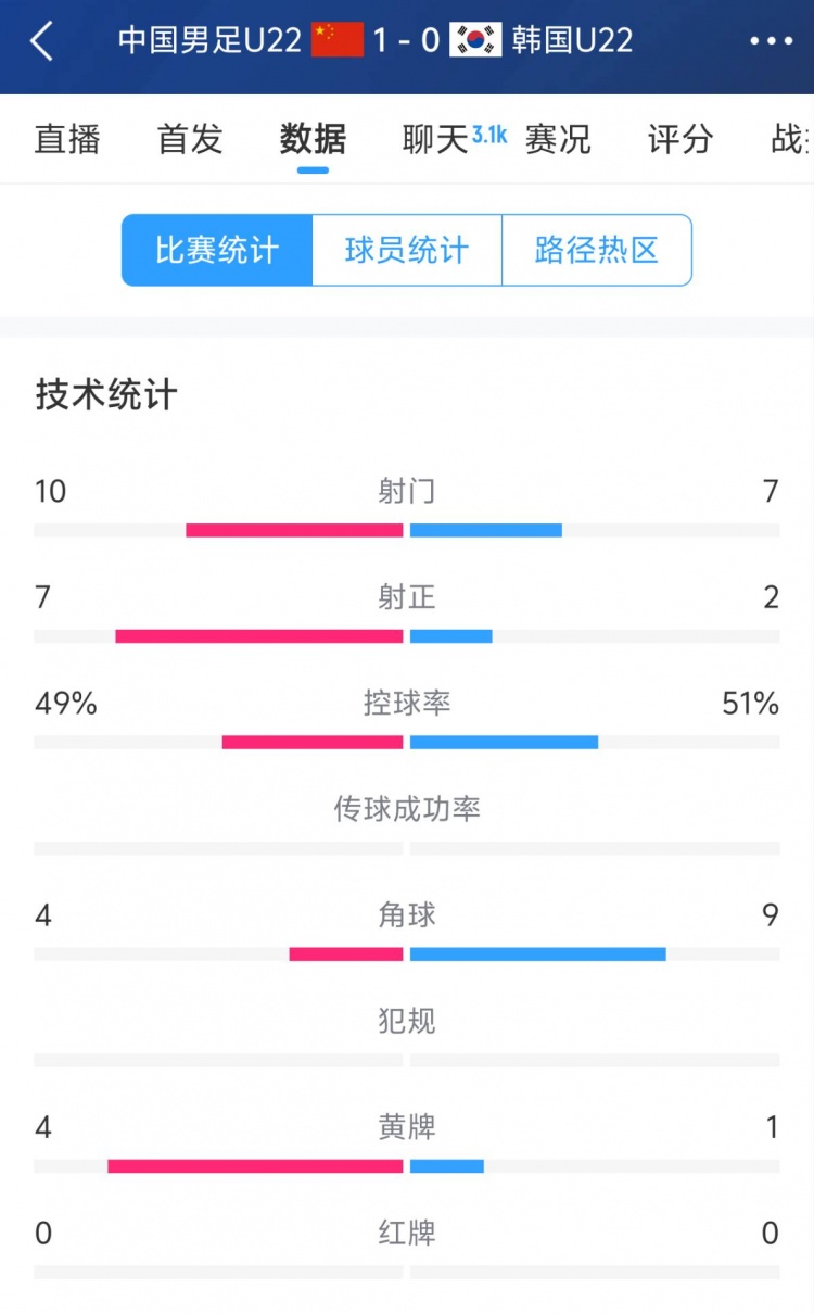 2025-03-23 17:45:07U22國(guó)足1-0韓國(guó)全場(chǎng)數(shù)據(jù):控球率49%落后韓國(guó),10射7正領(lǐng)先對(duì)手