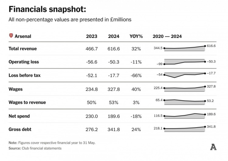 也正因?yàn)槿绱?,在阿森納已經(jīng)連續(xù)六年出現(xiàn)虧損的情況下,PSR已然成為槍手所有者和球迷共同關(guān)心的話題。但說實(shí)話,大家也不需要過多擔(dān)心——盡管他們不能像其他球隊(duì)那樣申報高額虧損。