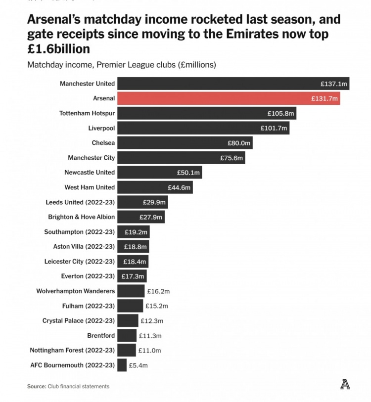 所以,那個賽季阿森納拿下了單賽季隊(duì)史最高門票收入,國內(nèi)比賽日收入躍升聯(lián)賽第二位。去年阿森納的比賽日收入僅比曼聯(lián)少了550萬英鎊,這也意味著兩隊(duì)之間的差距明顯縮?。捍饲皟蓚€賽季,兩隊(duì)的比賽日收入都相差超過3000萬英鎊。盡管酋長球場的建設(shè)成本,可能在過去幾年里限制了球隊(duì)的發(fā)展,但如今搬遷的好處正在越來越明顯。