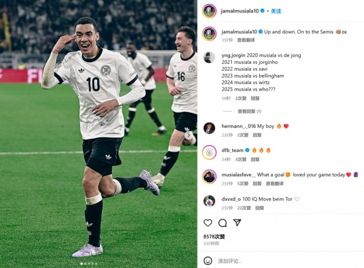 2025-03-24 09:27:47角球偷襲得手!穆西亞拉社媒曬照:有起有伏,晉級歐國聯(lián)四強!