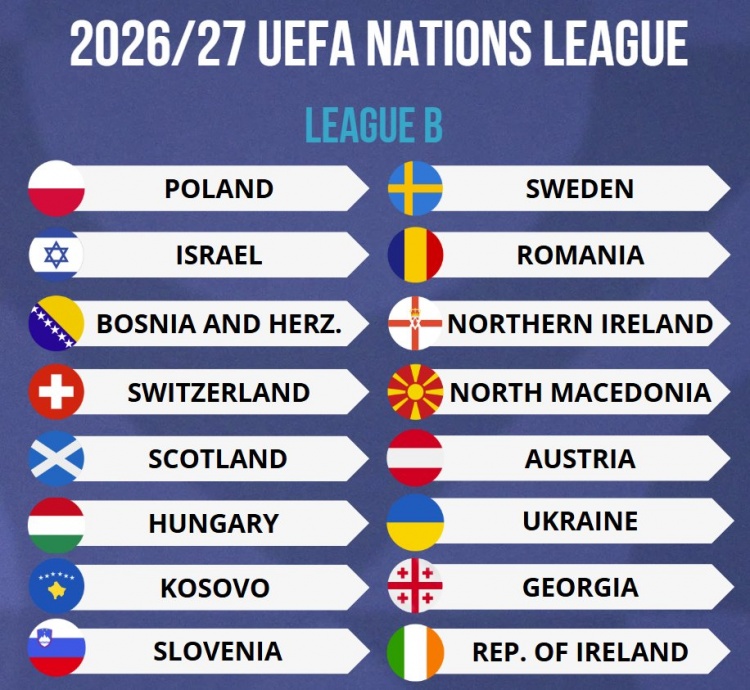 2025-03-24 09:28:10歐國聯(lián)2026-27賽季B級別球隊(duì)出爐:蘇格蘭、烏克蘭、波蘭在列