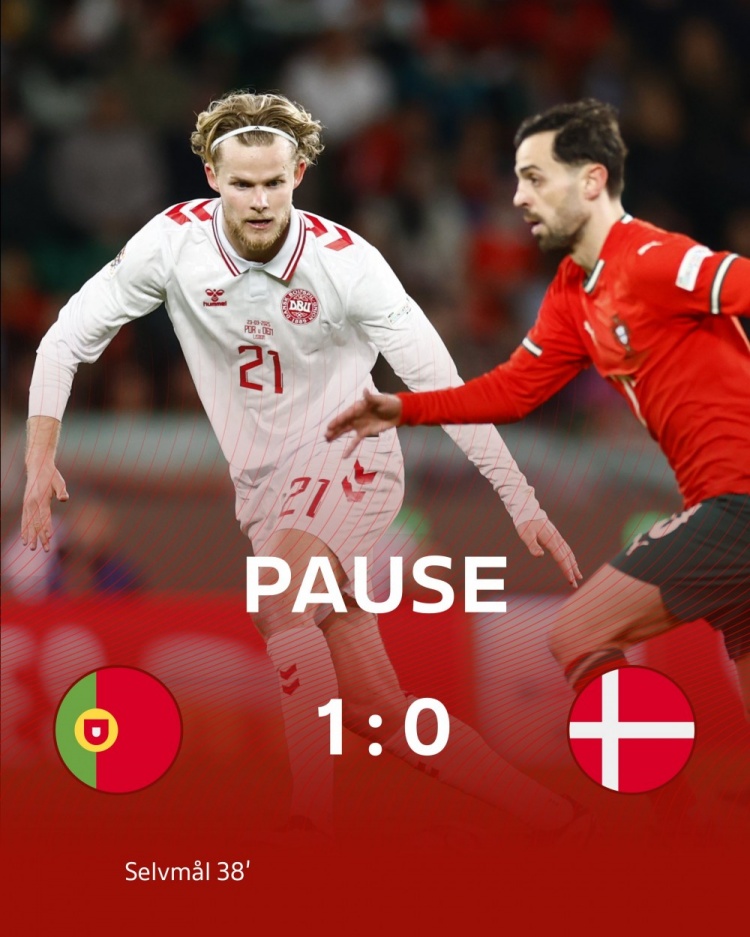 3月24日訊 北京時間3月24日03:45,歐國聯(lián)八強(qiáng)戰(zhàn)次回合葡萄牙迎戰(zhàn)丹麥的比賽在阿爾瓦拉德球場進(jìn)行,上半場C羅開場造點+點射被撲,達(dá)洛特頭球造險,B費角球造安德森解圍自擺烏龍,半場結(jié)束,葡萄牙1-0丹麥。