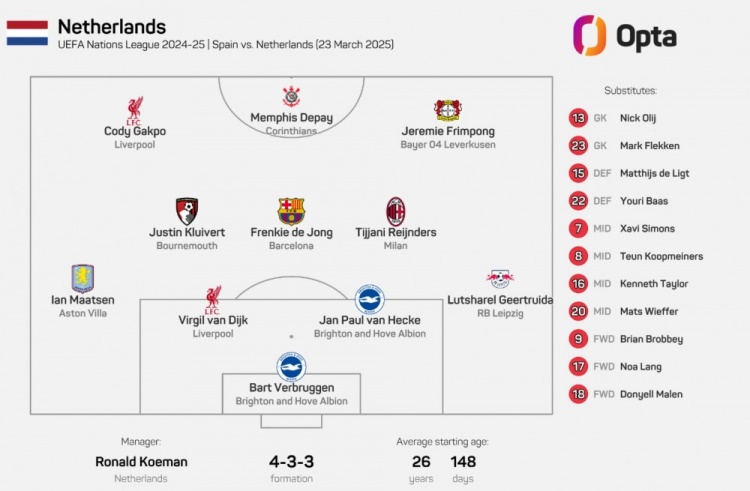 2025-03-24 09:30:012017年11月9日以來,荷蘭首發(fā)陣容首次無荷甲球員