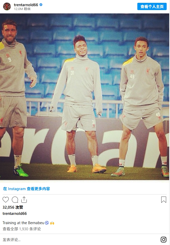 這是阿諾德首次從伯納烏的球員通道走出,他毫不猶豫在INS上發(fā)布了和斯特林以及蘭伯特在一起的照片并配文道:在伯納烏進行訓練。