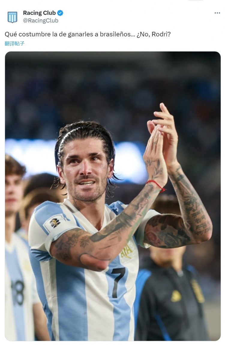 阿根廷競(jìng)技俱樂(lè)部社媒曬出自家青訓(xùn)國(guó)腳德保羅的照片,并寫道:“擊敗巴西人真是成習(xí)慣了,對(duì)吧,德保羅?”