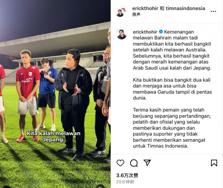 托希爾為這條Vlog配文寫道:“昨晚與巴林隊(duì)的勝利,顯示我們已經(jīng)從慘敗澳大利亞的比賽中振作起來,而此前我們也在客場慘敗日本隊(duì)后,主場擊敗沙特重新振作。我們證明了自己兩度跌倒,兩度爬起,希望我們能繼續(xù)努力,讓印尼足球在世界舞臺(tái)上展現(xiàn)自己?!?/p>