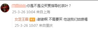 有網(wǎng)友在評(píng)論里留言提問(wèn)“你是不是沒(méi)買賈指導(dǎo)的茶葉?”對(duì)此王霜回復(fù)寫道:“謝謝啊,不需要買,他送我們姑娘喝?!?/p>