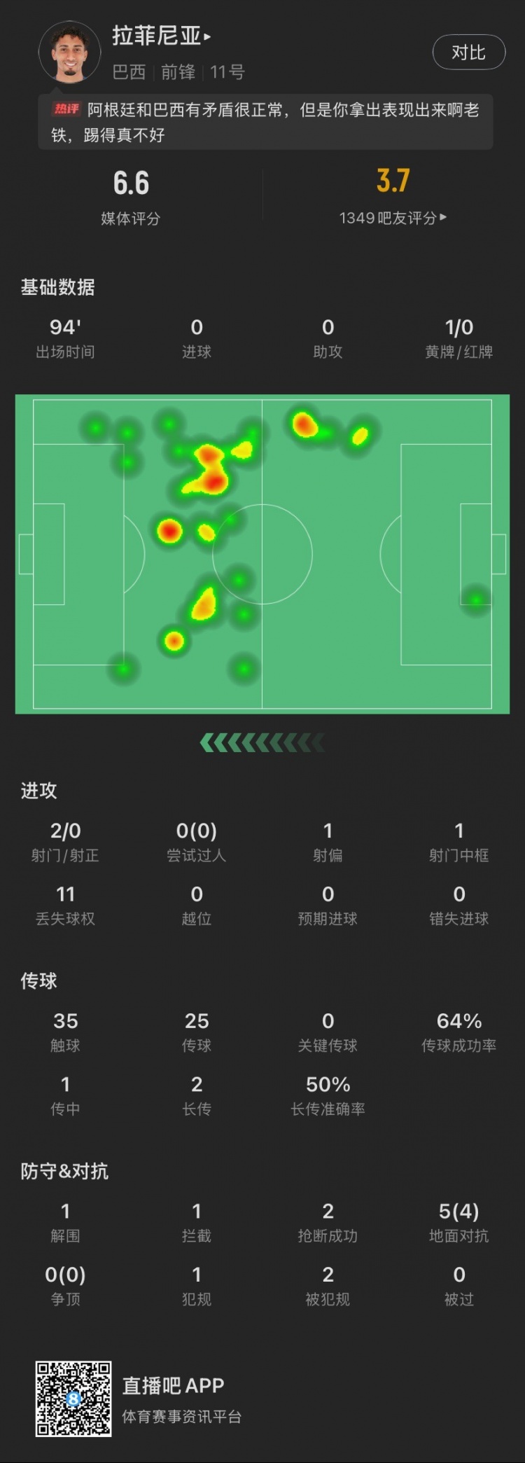 2025-03-26 20:44:02白放狠話了?拉菲尼亞本場:2射0正1中框,1黃牌,5次對抗成功4次