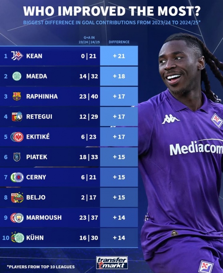 2月26日訊 《轉(zhuǎn)會市場》統(tǒng)計了歐洲前十聯(lián)賽球員相比上賽季的直接參與進球提升情況,小基恩居首。