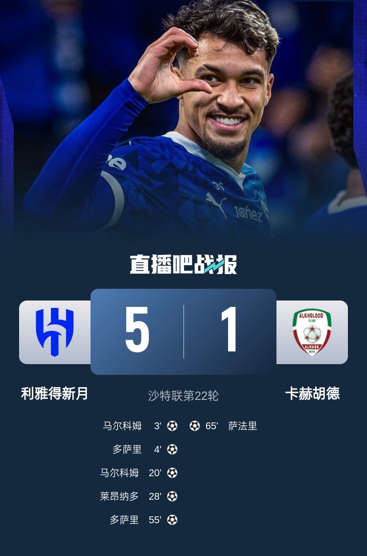 沙特聯(lián)第22輪,利雅得新月5-1大勝卡赫胡德,先賽落后榜首4分。