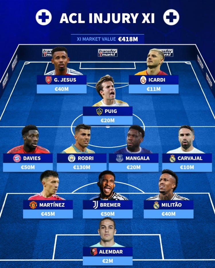 德轉(zhuǎn)排本賽季十字韌帶受傷陣:羅德里、戴維斯、二弟、米利唐在列