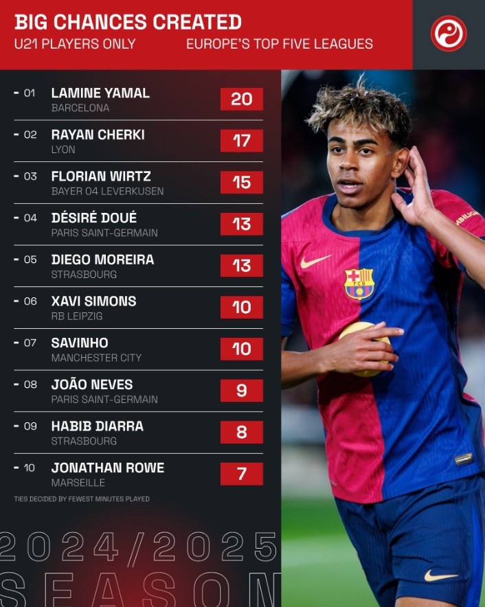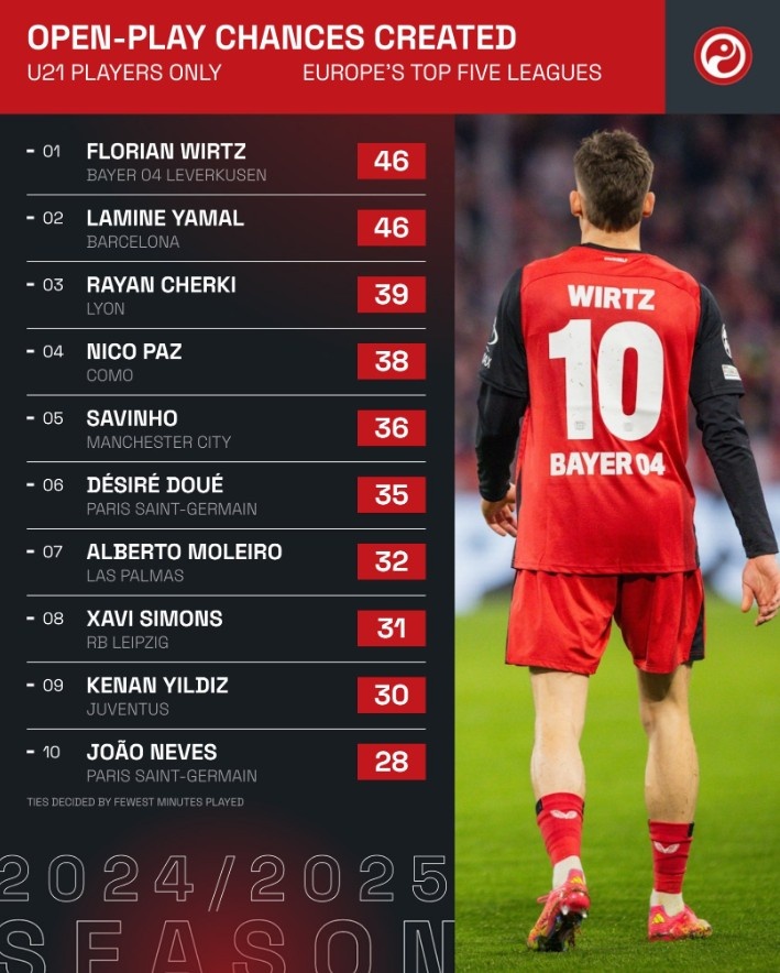 2025-03-27 08:48:28五大聯(lián)賽U21運動戰(zhàn)創(chuàng)造機會排行:亞馬爾、維爾茨46次并列榜首