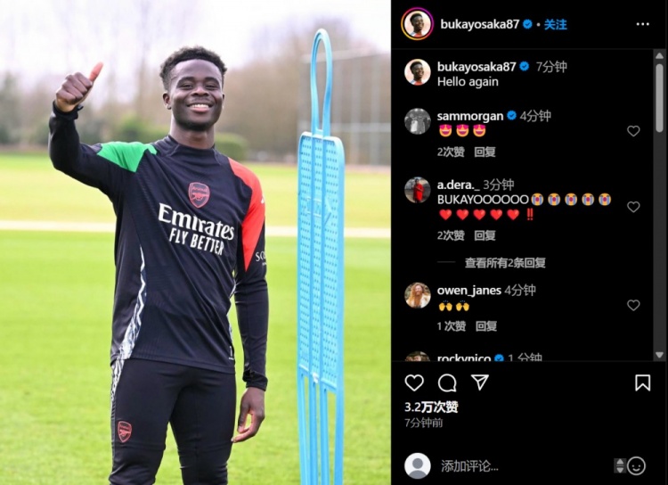 2025-03-28 02:02:14接近復(fù)出,薩卡社媒曬身穿訓(xùn)練服照片:又見(jiàn)面了