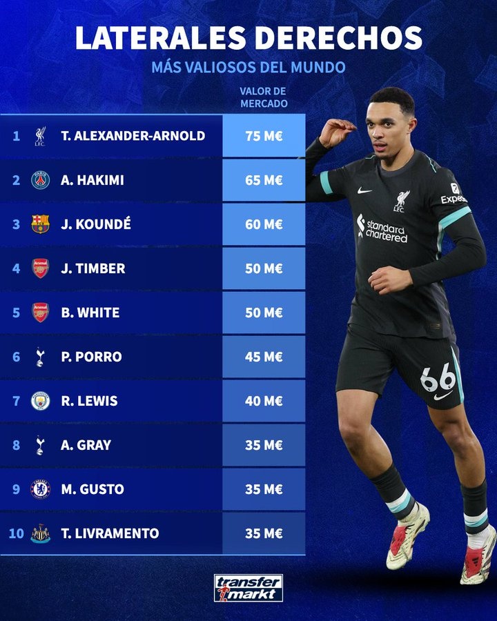 2025-03-28 19:38:01皇馬又免簽了個硬菜?德轉(zhuǎn)列右后衛(wèi)身價:阿諾德7500萬歐居首