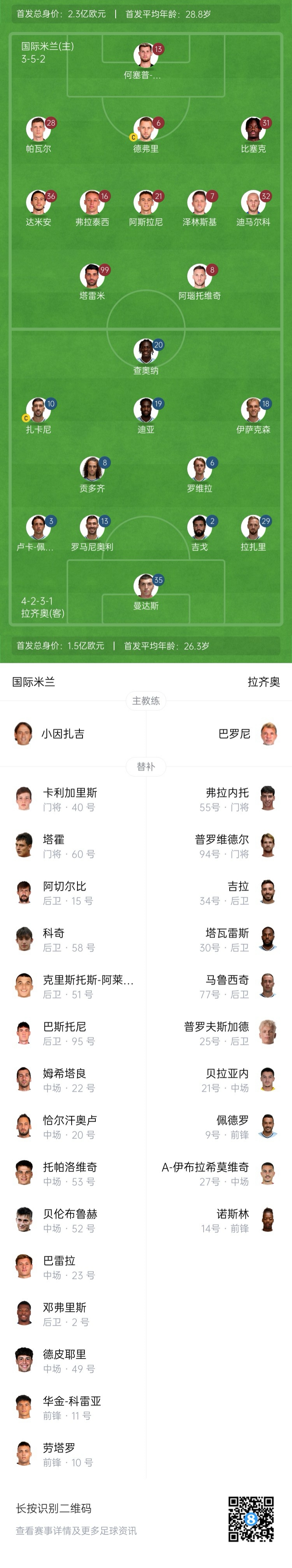 2月26日訊 意大利杯1/4決賽,國(guó)米對(duì)陣?yán)R奧,賽前首發(fā)公布。
