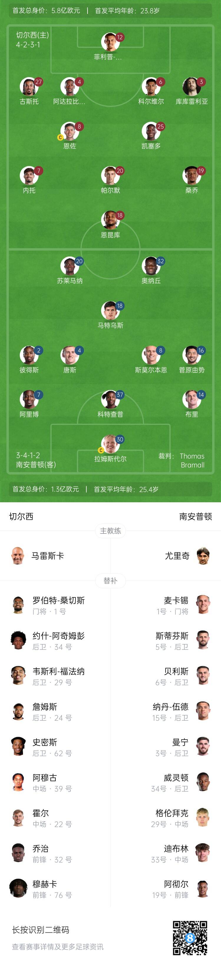 切爾西替補:1-羅伯特-桑切斯、24-里斯-詹姆斯、29-韋斯利-福法納、34-阿奇姆蓬、62-塞繆爾斯-史密斯、22-霍爾、39-阿穆古、32-喬治、76-穆赫卡