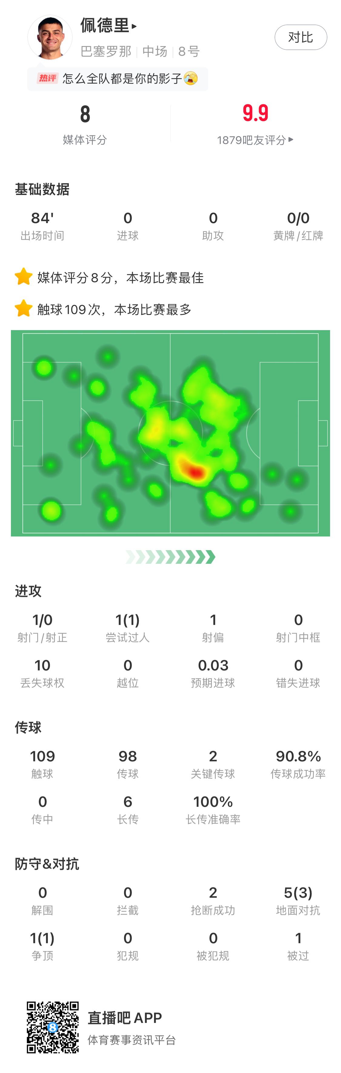 03月28日訊 國(guó)際比賽日后,巴薩補(bǔ)賽3-0擊敗奧薩蘇納,佩德里延續(xù)“大師級(jí)”表現(xiàn),109次觸球,98次傳球90.8%成功率,2次關(guān)鍵傳球,6次長(zhǎng)傳100%成功率,2次搶斷成功。