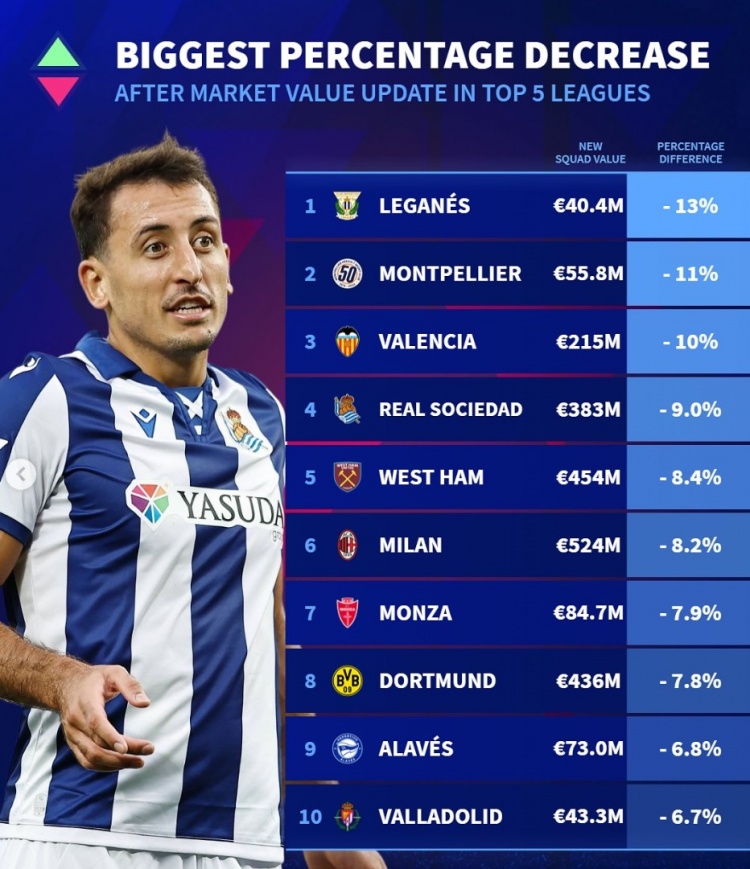 2025-03-28 19:49:54五大聯(lián)賽球隊(duì)身價(jià)貶值比例榜:米蘭多特下降約8%,皇社西漢姆在列
