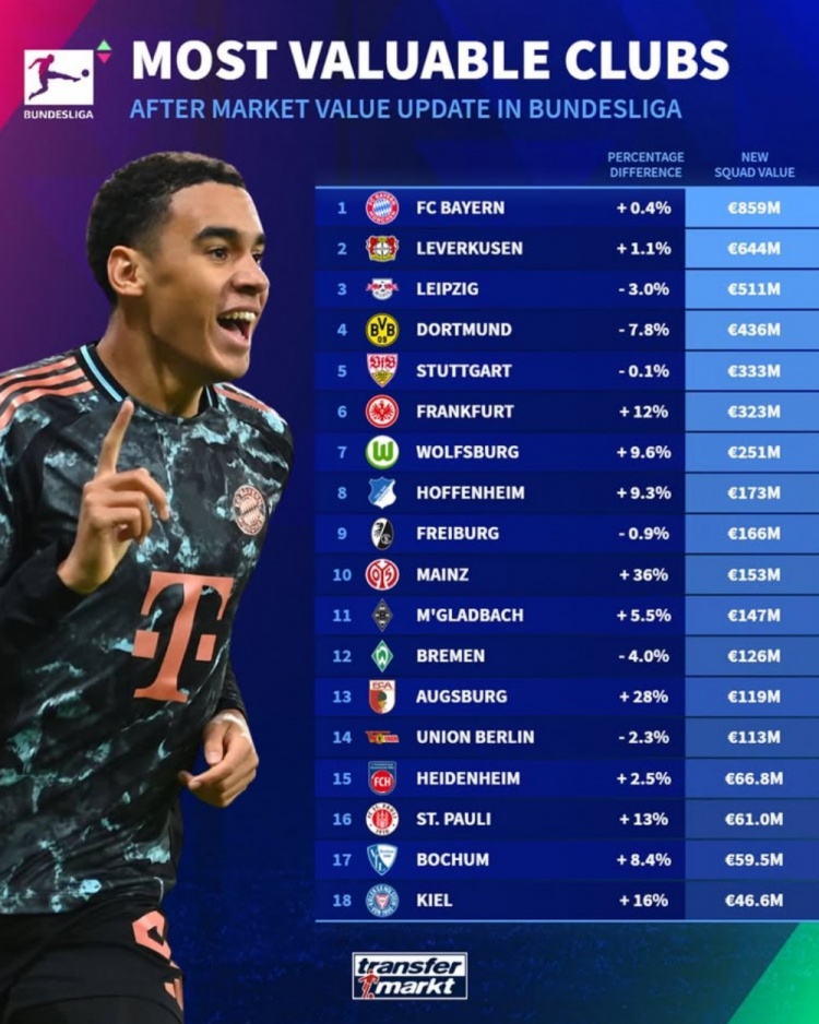 2025-03-28 19:55:49德甲球隊德轉(zhuǎn)身價榜:拜仁8.59億歐居首,藥廠萊比錫二三位