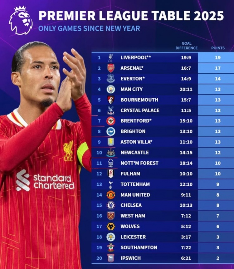 2025-02-26 08:11:292025英超積分榜:利物浦19分、阿森納17分,曼聯(lián)切爾西各8分