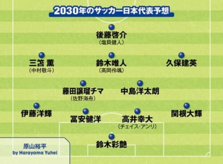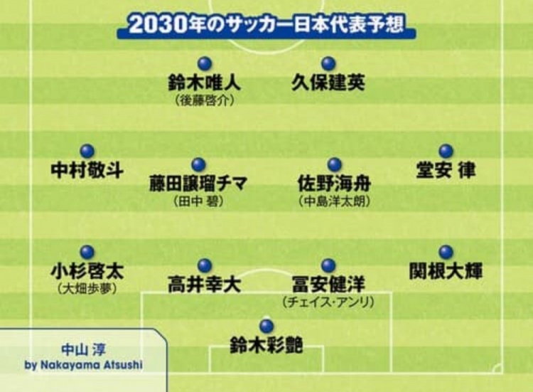 3月30日訊 據(jù)日媒Sportiva報道,近日該媒體開設專欄,開始對2030年世界杯日本隊首發(fā)陣容預測,有部分日本國內(nèi)的自由撰稿人投稿對首發(fā)進行預測。以上撰稿人預測的陣容中,基本都是本期日本國家隊陣中的年輕球員,并結合部分現(xiàn)役U22國家隊、U20國家隊球員等組合而成。