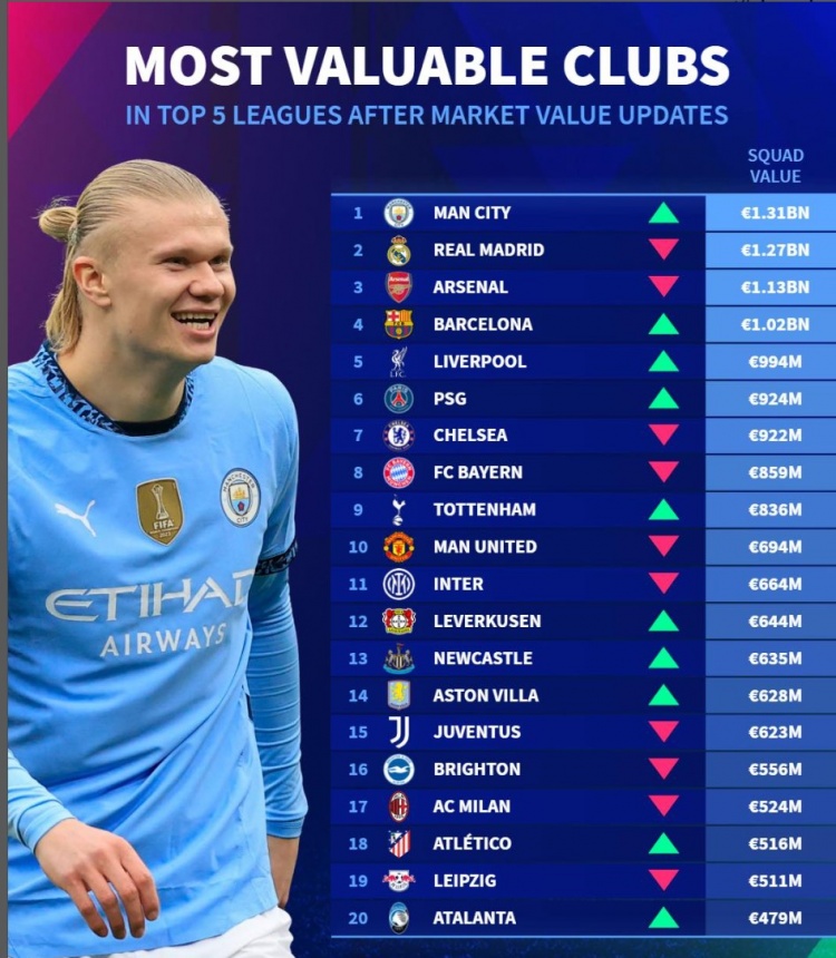 2025-03-30 20:11:18五大聯(lián)賽球隊(duì)最新身價(jià)榜:曼城壓皇馬居首,阿森納、巴薩分列三四