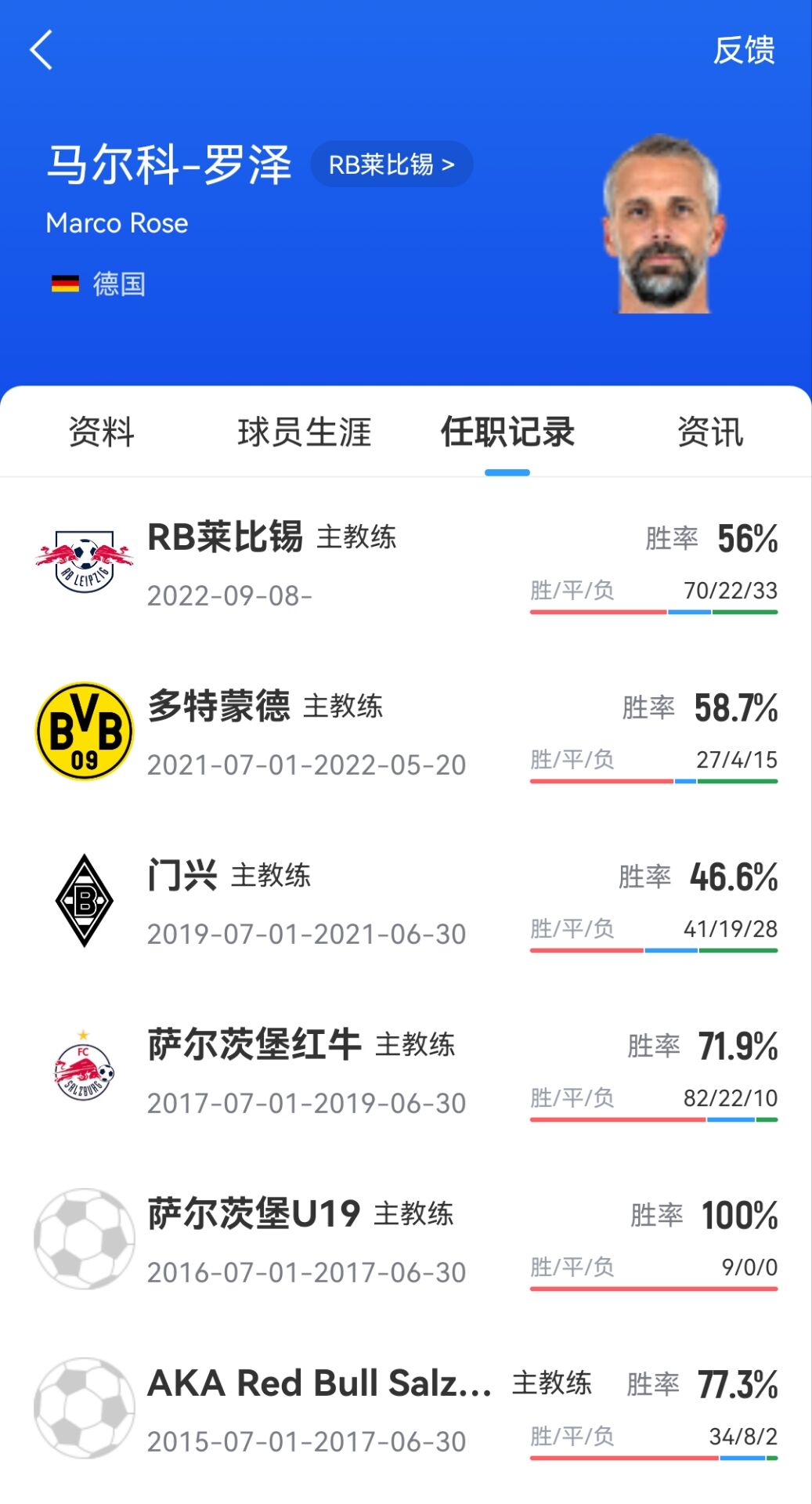 現(xiàn)年48歲的羅澤在2022年9月成為RB萊比錫萊比錫主帥,帶隊(duì)?wèi)?zhàn)績(jī)127場(chǎng)72勝22平33負(fù)。在羅澤執(zhí)教的第一個(gè)賽季,RB萊比錫就拿下了德國杯冠軍,并在2023/24賽季3-0完勝拜仁,拿到了德超杯冠軍。