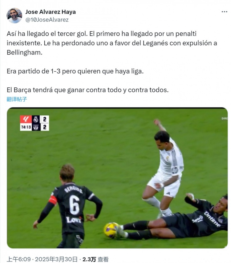 “皇馬任意球的犯規(guī)根本不該判,第三個(gè)進(jìn)球就是這樣來的?;蜀R的第一個(gè)進(jìn)球也是通過不存在的點(diǎn)球打進(jìn),裁判沒有判給萊加內(nèi)斯一個(gè)點(diǎn)球,也沒有將貝林厄姆罰下?!?/p>