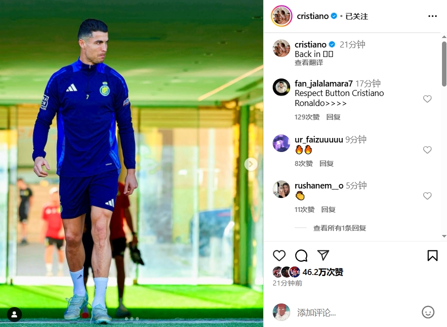 2025-03-30 20:26:39回歸訓(xùn)練!C羅社媒曬照身穿利雅得勝利訓(xùn)練服,配文:Back in