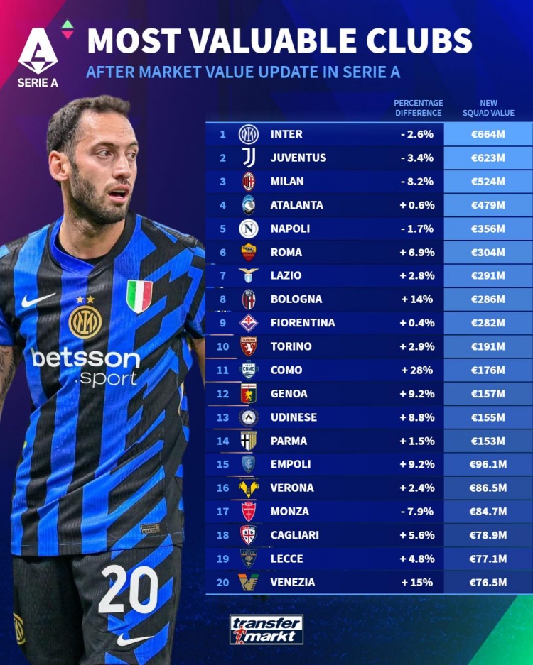 意甲球隊德轉(zhuǎn)身價排名(括號內(nèi)為變動幅度)