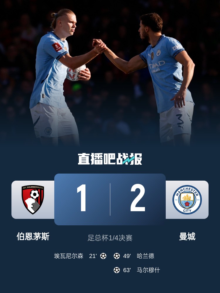 進4強!曼城2-1逆轉(zhuǎn)伯恩茅斯 哈蘭德破門+失點+傷退馬爾穆什建功