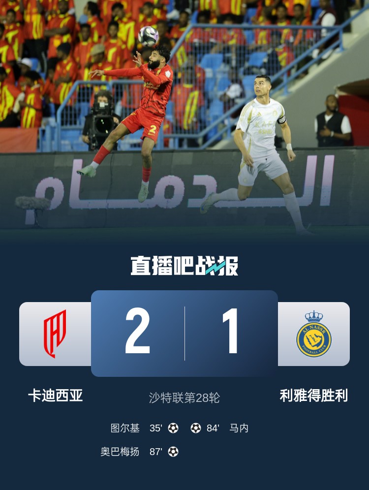 2025-04-19 16:46:09勝利落后!圖爾基反擊得手!利雅得勝利0-1落后卡迪西亞