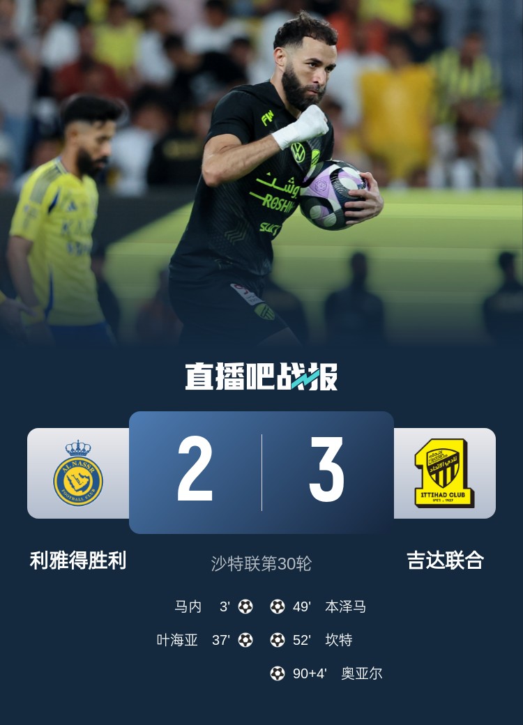 吉達(dá)聯(lián)合本輪3-2逆轉(zhuǎn)絕殺利雅得勝利!本澤馬、坎特和奧亞爾均破門。