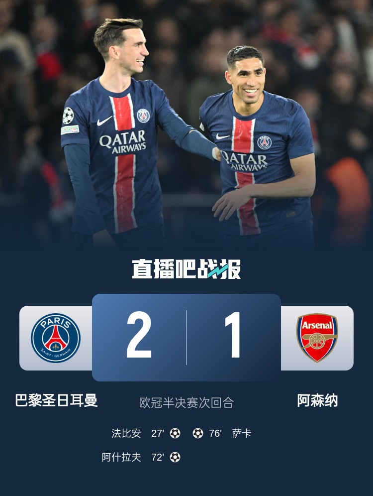 歐冠半決賽次回合,巴黎2-1總比分3-1淘汰阿森納,隊(duì)史第2次晉級歐冠決賽。