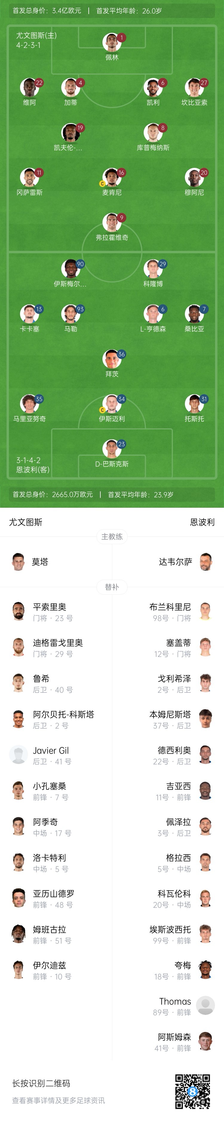 尤文首發(fā):1-佩林、22-蒂莫西-維阿、4-加蒂、6-凱利、27-坎比亞索、19-K-圖拉姆、8-庫(kù)普梅納斯、20-穆阿尼、16-麥肯尼、11-尼古拉斯-岡薩雷斯、9-弗拉霍維奇