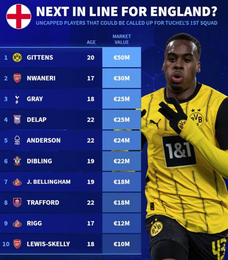 2025-02-27 08:12:29英格蘭仍未被征召最貴身價(jià)榜:吉滕斯領(lǐng)銜,恩瓦內(nèi)里、小貝林在列