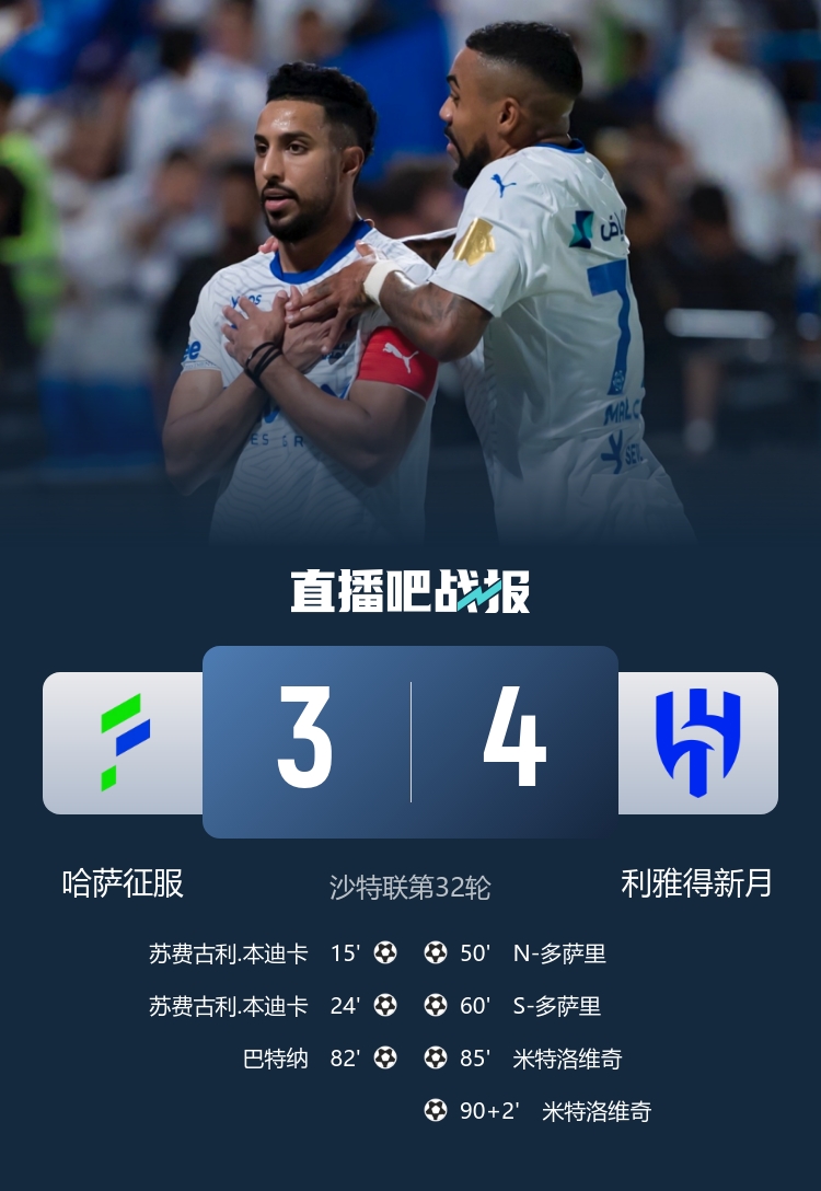 利雅得新月4-3哈薩征服,積71分排名第二,哈薩征服積33分排名第13位。