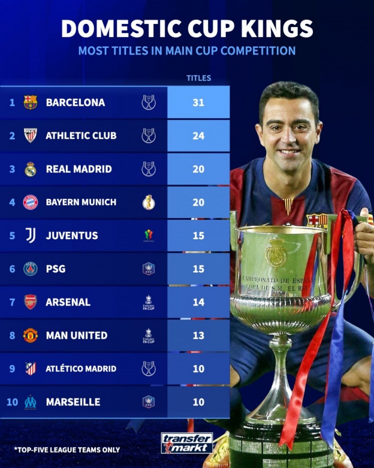 2025-02-28 00:32:05德轉(zhuǎn)列五大聯(lián)賽國內(nèi)杯賽奪冠榜:巴薩31次第1,畢巴24次第2