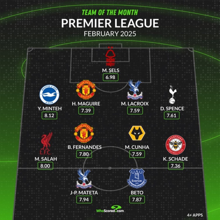 2025-03-01 08:10:05whoscored英超2月最佳陣:薩拉赫、B費領銜,馬奎爾、庫尼亞在列