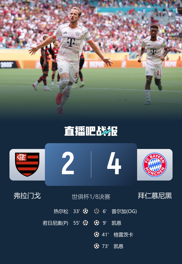 將戰(zhàn)巴黎!拜仁4-2弗拉門戈晉級8強(qiáng) 凱恩雙響格雷茨卡世界波