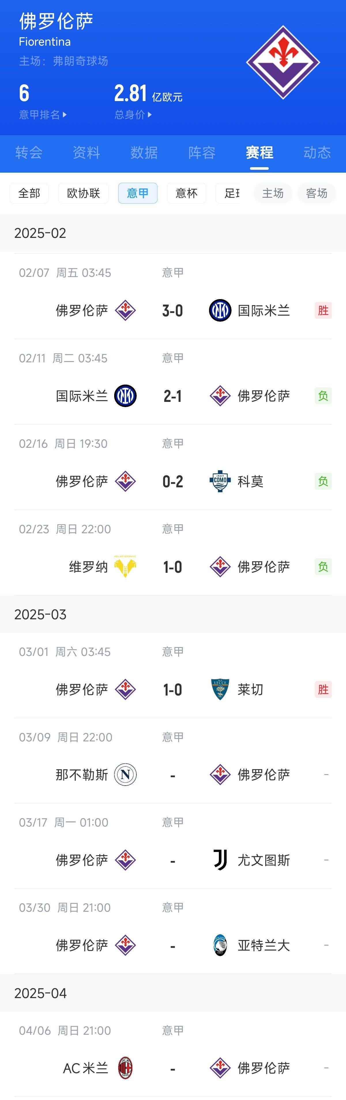 2025-03-01 16:06:55冠軍判官?佛羅倫薩未來3輪分別打意甲2/3/4,此前曾3-0第1名國米