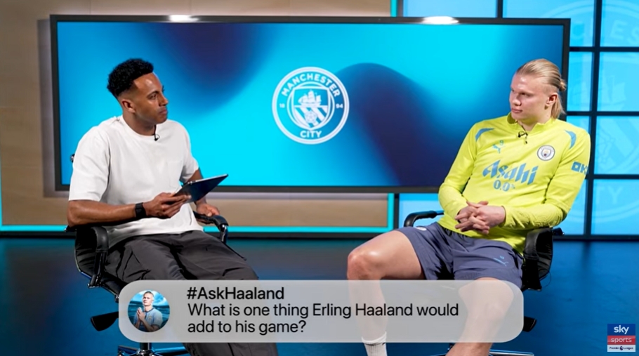 采訪者:“這是一個問哈蘭德的問題環(huán)節(jié)。我們在社交媒體上號召粉絲們與我們聯(lián)系,并向哈蘭德提問。哈蘭德,有成千上萬的人想問你問題,我們精選了一些最好的問題,你準備好回答了嗎?”