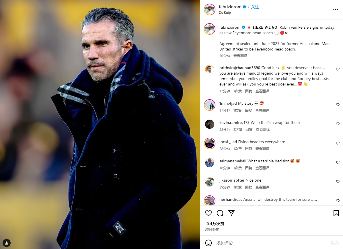 2025-02-21 17:46:56Here we go!羅馬諾:41歲范佩西出任費耶諾德主帥,簽約至2027