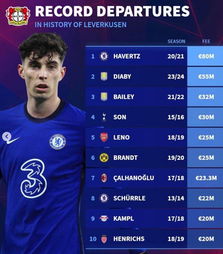 3月2日訊 《轉會市場》統(tǒng)計了勒沃庫森隊史賣人最貴榜,哈弗茨以8000萬歐元居首。